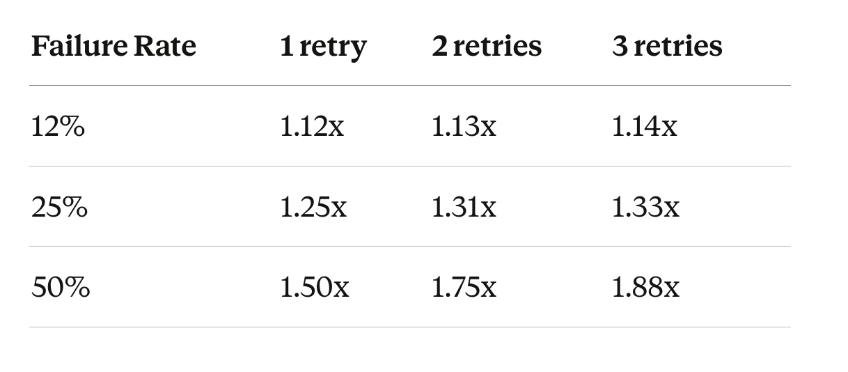 At 12% failure, 3 retries costs 1.14x — well within budget. At 25%, 2 retries already hits 1.31x — borderline. 3 retries blows past it. At 50%, even 1 retry exceeds your 1.3x budget. The failure rate determines how many retries you can afford, not the other way around.