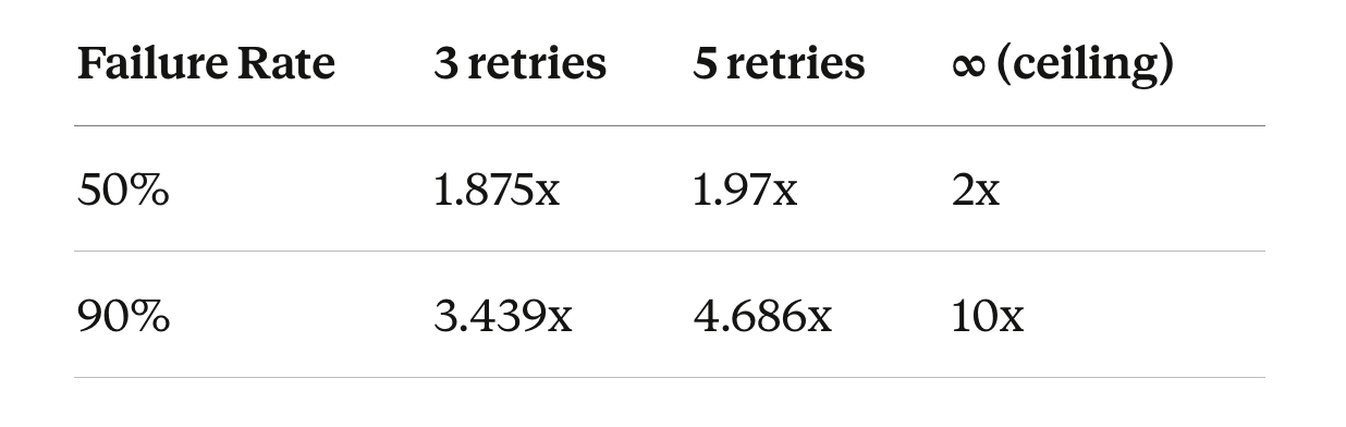 3.4x is what you pay today with 3 retries at 90% failure. 10x is the ceiling you’re asymptotically moving toward as retries increase. Each additional retry adds more load but barely improves success — at 90% failure, going from 3 to 5 retries costs 1.2x more traffic for a few percent more successes. You spend more and more traffic for smaller and smaller gains.