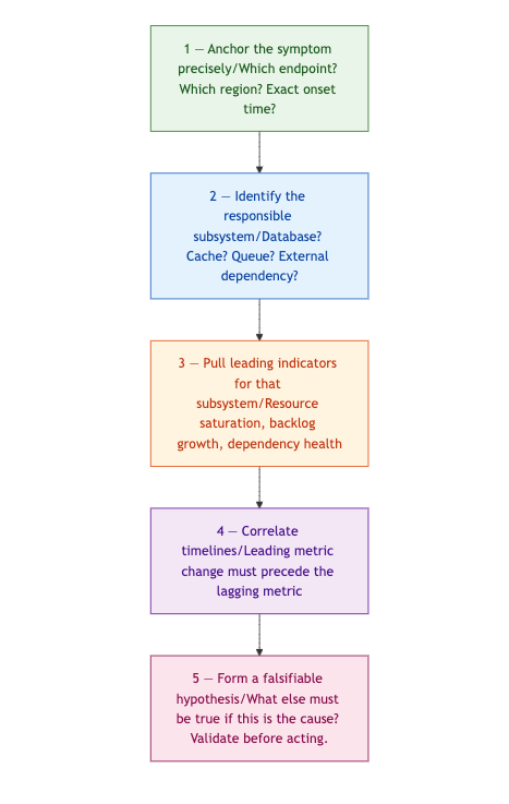 The framework is the same regardless of which system is degrading: anchor the symptom, walk to the responsible subsystem, pull its leading indicators, correlate the timeline, validate a falsifiable hypothesis. Five steps, consistent order, no shortcuts. That consistency is what separates a four-minute diagnosis from a four-hour one.