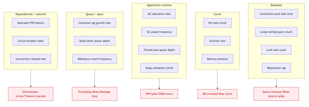 A leading metric measures a condition that precedes an outcome. Connection pool wait time, GC allocation rate, consumer lag growth rate, upstream dependency P99 — these are where the cause lives. They are almost never in your SLOs and rarely trigger alerts.