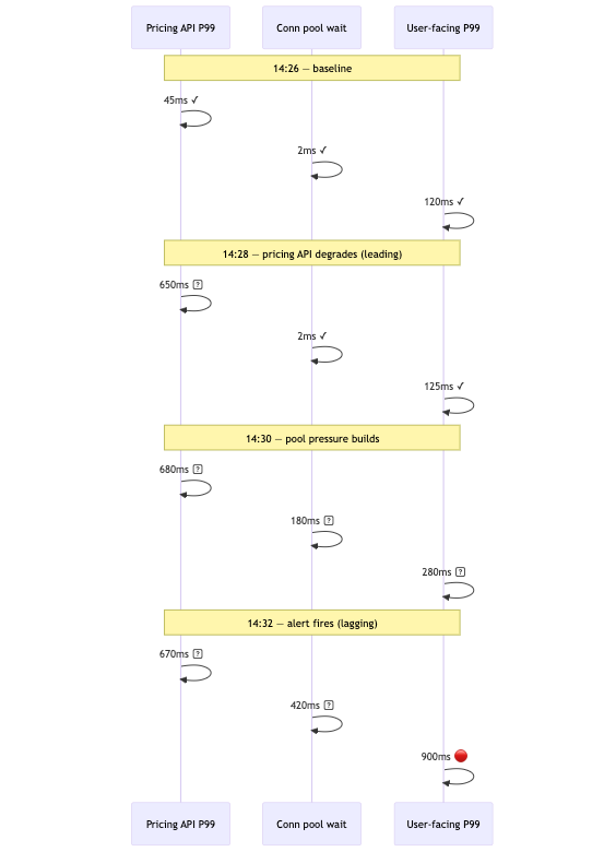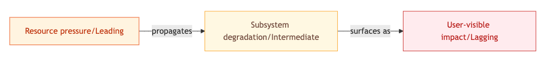 Lagging metrics tell you that impact has reached users. Leading metrics tell you why, and when the condition started. The time gap between them is where root cause analysis actually lives.
