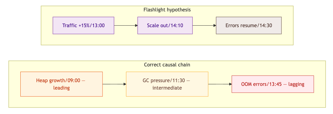 The 09:00 start time, surfaced by the leading metric, is what you correlate against deployments and cron jobs. That's your root cause window — not 13:00.