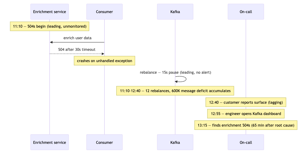 The fix isn't Kafka tuning. It's the enrichment service. The leading metric — enrichment upstream call error rate from within the consumer — was always available. It had no dashboard and no owner.