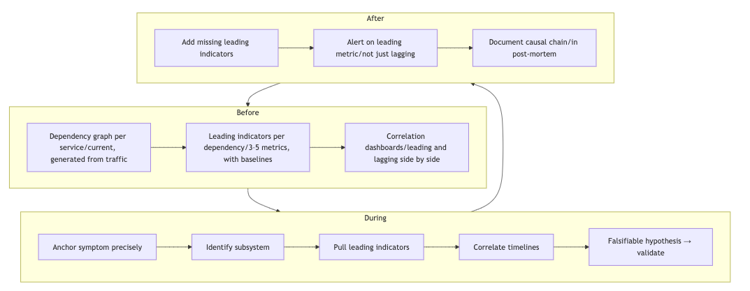 Each incident exposes at least one leading metric that should have been visible. Add it. The post-mortem's job isn't just blame assignment — it's extending the observability surface so the same causal chain is visible earlier next time.