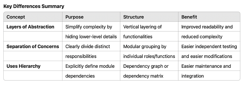 Understanding these three key concepts — layers of abstraction, separation of concerns, and uses hierarchy — can greatly enhance software design, making systems more maintainable, scalable, and robust. Embracing these principles will empower you as a developer to manage complexity more effectively and write software that’s easier to maintain and extend.