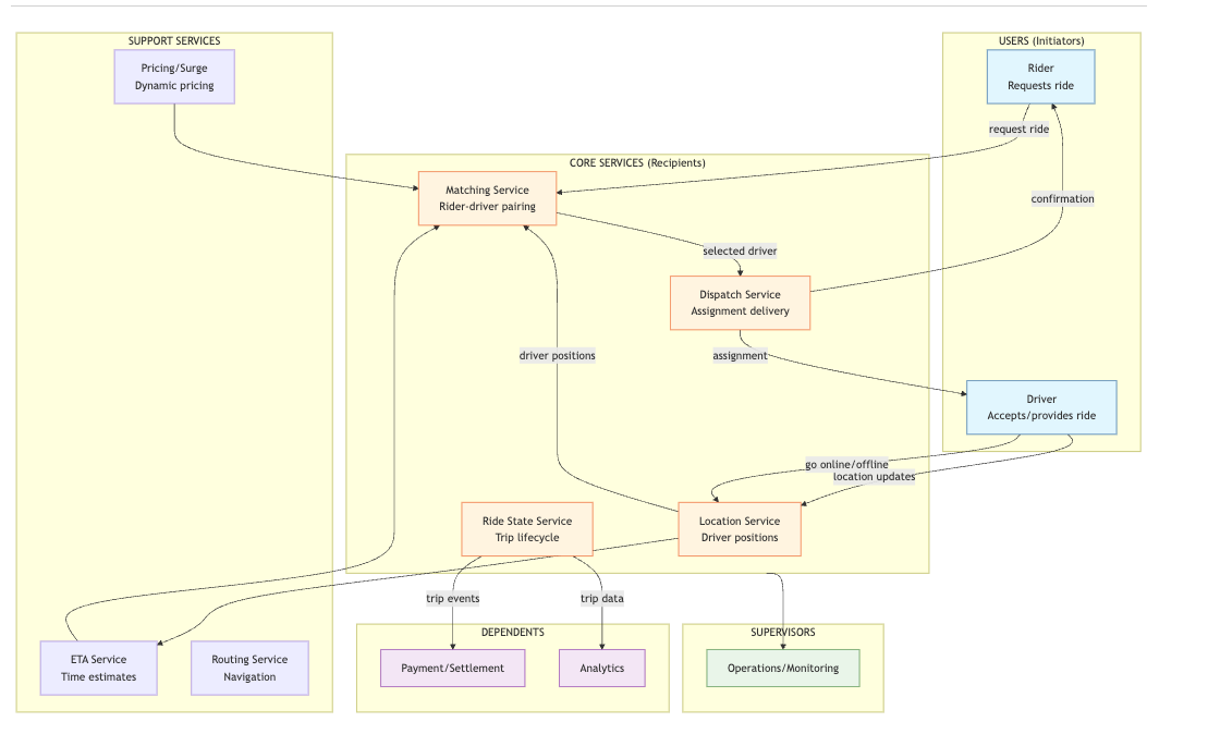 | Dispatch | Timeout length | Rider (short) vs Driver (long) | Short = more reassignments; long = more waiting |